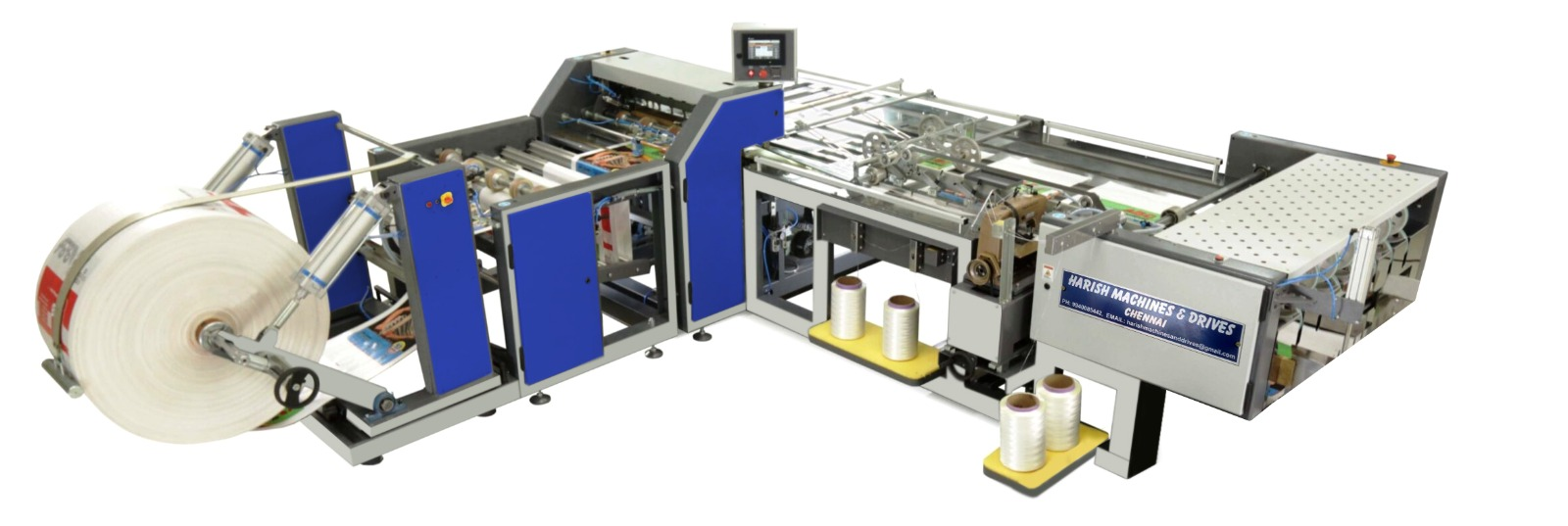 Harish Machines & Drives bcs series is a high speed conversion line for cross cutting, bottom folding, sewing and finally stacking of finished HDPE/PP woven fabric bags in one continuous operation. This machine can be used for bag conversion from plain woven. Special attachments for producing gusseted bags, perforated bags and bags with easy open top stitch are also available.